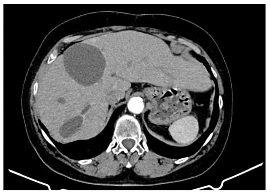 A chest X-ray showed significant elevation of the right hemidiaphragm without other notable changes. An abdominal–pelvic ultrasound indicated a heterogeneous liver texture with multiple anechoic lesions, including two large ones: 9 × 13.7 cm in the left hepatic lobe and 7 × 11 cm in the right hepatic lobe.