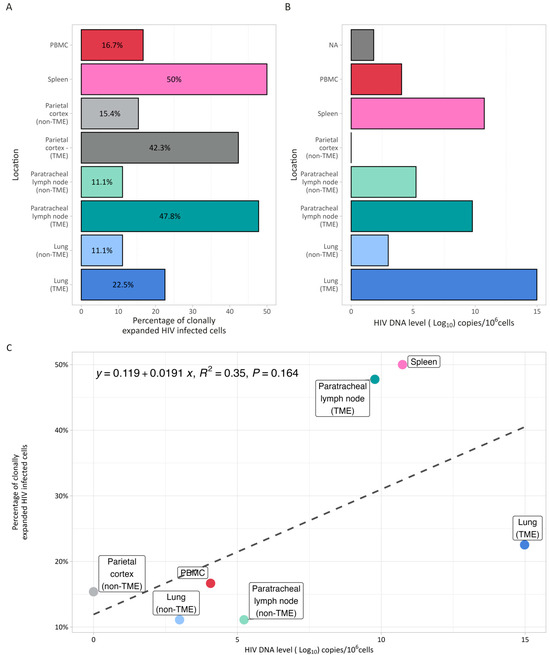 HIV reservoir size and clonality. (A) Percentage of clonally expanded cells identified by integration site sequencing in blood, spleen, paired TME and non-TME parietal cortex, lymph nodes and lung. (B) HIV DNA level (expressed in log10 copies/106 cells) determined by digital droplet PCR in the same samples. Compared to non-TME tissues, paired TME tissues from the lung, lymph nodes, and parietal cortex had a higher proportion of clonally expanded HIV-infected cells and higher HIV DNA levels, although these differences were not statistically significant (p = 0.07 and p = 0.18). (C). Association between HIV DNA level (x axis) and percentage of clonally expanded cells (y axis). There was no significant association between HIV reservoir size (DNA level) and the percentage of clonally expanded HIV-infected cells.