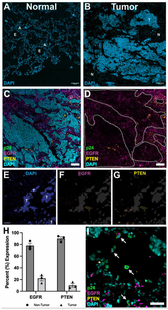 Immunofluorescence analysis of tumor tissue. (A,B) Tissue architecture of normal and tumor tissue from PWH nuclear stained with DAPI to show cell organization. Normal tissue shows defined tissue architecture revealing epithelial airway (E) and alveolar (A) regions. Tumor regions (T) show loss of regular tissue architecture, revealing dense aggregations of nuclei compared to normal regions (N). Scale bar = 200 μm. (C) Tumor region stained for nuclei (DAPI/cyan), HIV p24 (green), EGFR (magenta), and PTEN (yellow). Scale bar = 200 μm. (D) Same image as (C) with DAPI staining removed. Tumor regions were outlined (white dotted line). (E–G) Automated segmentation of tumor regions (E) to analyze EGFR (F) and PTEN (G) expression associated with tumor regions (T). Scale bar = 100 μm. (H) Percent expression of EGFR and PTEN within non-tumor (black circles/dark gray bars) and tumor (black triangles/light gray bars) regions. Error bars = SEM. (I) Immunofluorescence of HIV p24 (green), nuclei (DAPI/cyan), PTEN (yellow), and EGFR (magenta). White arrows indicate HIV p24 expressing cells co-expressing EGFR. Scale bar = 50 μm.