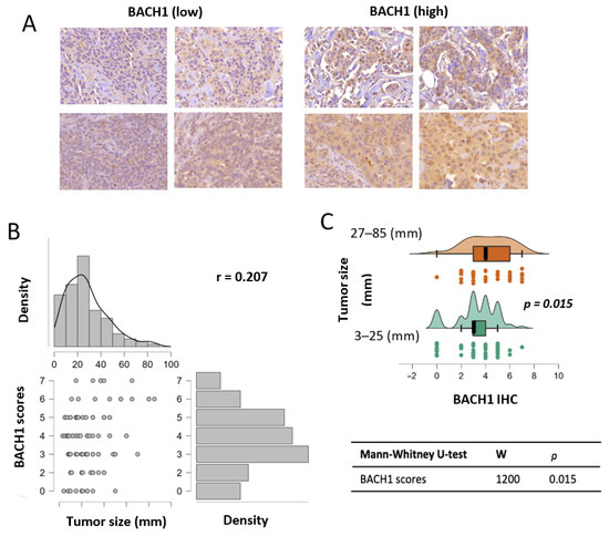 Using BACH1 IHC scores, we analyzed the association between BACH1 levels and the biological variables of patient tumors. Given our relatively small sample size for subgroups of interest and non-normal distributions of BACH1 scores, we used nonparametric models for the statistical analyses in our study [30]. Our general hypothesis was to determine whether BACH1 levels were differentiated according to tumor characteristics. We tested BACH1 expression levels using IHC scores by tumor size, measured by diameter. An expression correlation analysis indicated that BACH1 IHC scores were positively correlated with tumor size. That is, BACH1 protein expression levels were higher in tumors with bigger diameters (Spearman coefficient = 0.207, p = 0.027) (Figure 1B). Likewise, we further divided patient tumors into two groups based on tumor diameter, specifically, small tumors (3–25 mm in diameter, N = 65) vs. big tumors (27–85 mm in diameter, N = 50) (Supplementary Data Table S1). This split corresponded to the 50th percentile of the tumor size distribution. The mean value of BACH1 IHC scores in smaller tumors was 3.292 (SD = 1.1693), whereas it was 4.2 (SD = 1.796) in bigger tumors. When BACH1 IHC scores were compared in the two tumor diameter groups using the Mann–Whitney U test for independent samples, we found a significant difference (p = 0.015) between the groups, showing that the bigger tumor group had higher BACH1 IHC scores than the smaller tumor group (Figure 1C).