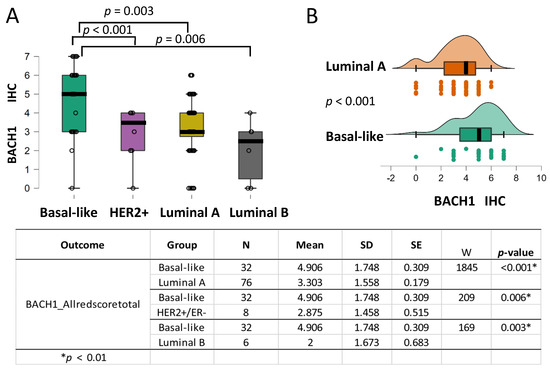 BACH1 expression is higher in the basal-like subtype than in the other breast tumor subtypes. (A) Box plots indicating BACH1 IHC scores by breast cancer subtype: basal-like (N = 32), HER2+ positive (N = 7), luminal A (N = 76), and luminal B (N = 5) subtypes. (B) Independent group comparison of BACH1 scores in basal-like (N = 32) and luminal A (N = 76) subtypes showing significantly higher BACH1 scores in basal-like tumors than in the luminal A subtype (p < 0.001, Rank-Biserial Correlation = 0.517), according to a Mann–Whitney U-test for cross-comparison. Score mean, standard deviation (SD), standard error (SE), and coefficient of variation in the subtype groups are shown by the subtype groups. The same trend is observed when comparing the basal-like subtype with the HER2+ subtype (p = 0.006) and the basal-like subtype with the luminal B subtype (p = 0.003).