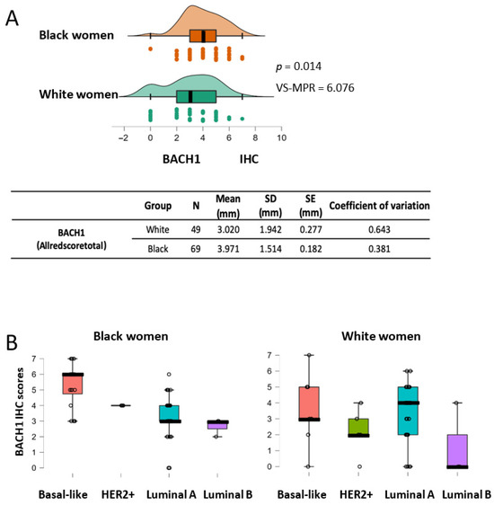 BACH1 expression scores are higher in Black women than in White women, as well as in basal-like subtype tumors from Black women. (A) BACH1 IHC score comparison between Black women (N = 69) and White women (N = 49) using the Mann–Whitney U test (p = 0.014, VS-MPR is 6.076). Mean score of tumor size (millimeter, mm), standard deviation (SD), standard error (SE), and coefficient of variation are shown by ethnic group. (B) Box plots indicate BACH1 IHC scores by tumor subtypes among Black or White patients.