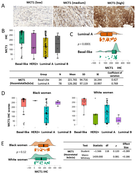 MCT1 expression by breast cancer subtype. (A) Representative IHC images of MCT1 staining with low to high intensity in the breast TMA. (B) Boxplots showing MCT1 IHC scores by the subtypes of breast tumors (basal-like N = 31, HER2+ N = 7, luminal A N = 70, and luminal B N = 6). (C) MCT1 score analysis between luminal A (N = 78) and basal-like subtypes (N = 34) (p < 0.0001) using the Mann–Whitney U test. An effect size of 0.561 is given by the rank-biserial correlation. (D) Boxplots showing MCT1 IHC scores by tumor subtype from Black (left) and White women (right). (E) Distribution plots indicating that MCT1 scores have no statistical difference between race groups according to Student’s t test (p = 0.12) or the Mann–Whitney U test (p = 0.081).