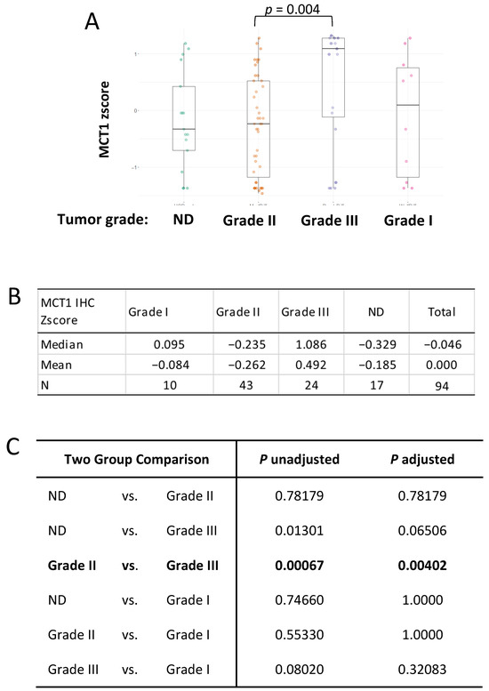MCT1 expression is higher in the Grade 3 tumor subgroup. (A) Box plots indicating MCT1 IHC z-scores by breast cancer grade using the Kruskal–Wallis’s test. (B) Median and mean of MCT1 IHC z-scores in each group; Grade 1 (N = 10), Grade 2 (N = 43), Grade 3 (N = 24), and Not Determined (N = 17) are shown. (C) Kruskal–Wallis’s multiple-comparison, with p-values adjusted with the Holm method, is shown in the table.