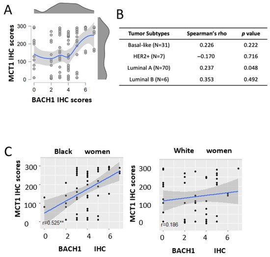 Of note, there was a positive correlation between BACH1 and MCT1 expression using IHC scores, particularly among Black women. Since our previous study demonstrated that BACH1 suppresses MCT1-dependent lactate oxidation pathways in TNBC [17], a negative correlation was expected between BACH1 and MCT1 expression in the basal-like subtype of breast tumors. Small sample size would not provide enough power to compare the expression in basal-like or HER2+ subtypes of tumors, which is noted as a limitation of our current study, although the study included patient race, tumor subtypes, and clinical variables. In particular, it should be noted that consideration of BACH1 expression levels, particularly in luminal B subtype tumors among Black and White women, using a larger patient dataset would provide a better understanding of whether BACH1 expression is dependent on race or tumor subtypes. In addition, it is suggested that additional analyses of MCT1 and BACH1 expression at the single-cell level in each tumor type be conducted, as we analyzed total IHC scores per tumor slide rather than examining cellular levels of each molecule. This method could address and advance the limitation of our current analysis, as correlation analyses using tumor tissues containing heterogeneous cancer cell populations cannot access the possibility of exclusive expression between BACH1 and MCT1 at the single-cell level. Furthermore, the inclusion of other known predictive markers in the future study would support our findings, suggesting that, together with BACH1, they may serve as a stronger indicator of patient outcome.