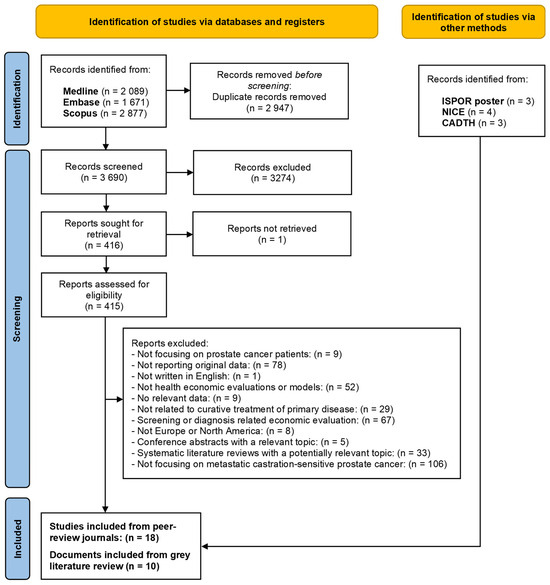 Since evidence not published in peer-reviewed journals can contribute to the comprehensiveness of a systematic review, grey literature sources were included in the search strategy. To find relevant health economic evaluations and models related to PC, relevant health technology assessment/appraisal agencies and conference abstracts were searched, which include the International Society for Pharmacoeconomics and Outcomes Research (ISPOR), the National Institute for Health and Care Excellence (NICE), and the Canadian Agency for Drugs and Technologies in Health (CADTH), among others (see the full list in Appendix A, Table A5).
