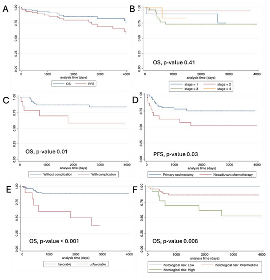 Continuous variables were expressed as mean ± standard deviation and compared using Student’s t-test or the Mann–Whitney U test, as appropriate. Categorical variables were compared using the Chi-square test or Fisher’s exact test, where appropriate. Multivariable logistic regression was used to identify independent predictors of surgical complications. Median follow-up time was up to the last follow-up visit or, in cases of death, December 2024. Survival outcomes were analyzed using Kaplan–Meier curves and compared using the log-rank test. The Cox proportional-hazards model was applied to assess factors associated with OS and PFS. A p-value < 0.05 was considered statistically significant. Analyses were performed using STATA version 14.0 (StataCorp LLC, College Station, TX, USA).