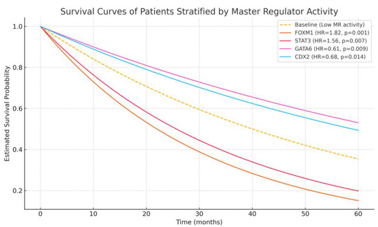 Survival curves of patients stratified by master regulator activity. Kaplan–Meier survival curves illustrating overall survival probabilities over time for patients stratified by master regulator (MR) activity levels. Elevated FOXM1 (HR = 1.82, p = 0.001) and STAT3 (HR = 1.56, p = 0.007) activities were associated with reduced survival, while higher GATA6 (HR = 0.61, p = 0.009) and CDX2 (HR = 0.68, p = 0.014) activities predicted improved outcomes. Baseline curve represents low MR activity.