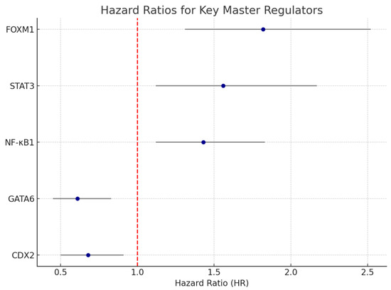 Forest plot of hazard ratios for key master regulators. Summary of forest plot illustrating the hazard ratios (HRs) and 95% confidence intervals (CIs) for master regulators significantly associated with overall survival in the TCGA cohort. FOXM1, STAT3, and NF-κB1 were associated with poor prognosis (HR > 1), while GATA6 and CDX2 were linked to favorable outcomes (HR < 1). These findings were adjusted for confounding clinical variables in multivariate Cox regression models. The red dashed line indicates the null value (HR = 1), where no effect is observed.