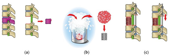 Schema of second-generation TES. (a) en-bloc excision of the vertebra (or vertebrae); (b) the resected lamina and vertebral body, containing tumors, are used as bone grafts for anterior spinal reconstruction. These are placed in liquid nitrogen (−196 °C) for 20 min before being crushed and packed into a titanium cage with a sufficient amount of autologous, unfrozen grafts harvested during the resection procedure); (c) the cage is placed between the adjacent healthy vertebral bodies, and spinal shortening is performed to stabilize the cage [12].