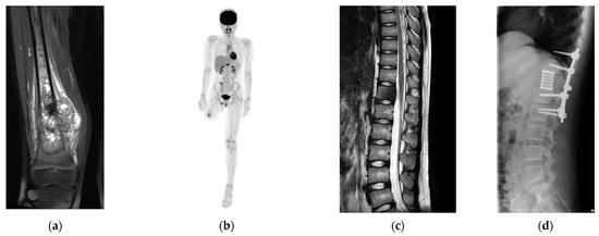 Clinical course of a 10-year-old male with conventional osteosarcoma. (a) Image of the primary lesion (right proximal femur, short τ inversion recovery). (b) Positron emission tomography shows a single metastasis in the 12th thoracic spine. (c) Sagittal image of the spine (T2-weighted image) and (d) after surgical resection of the 12th thoracic spine and reconstruction.