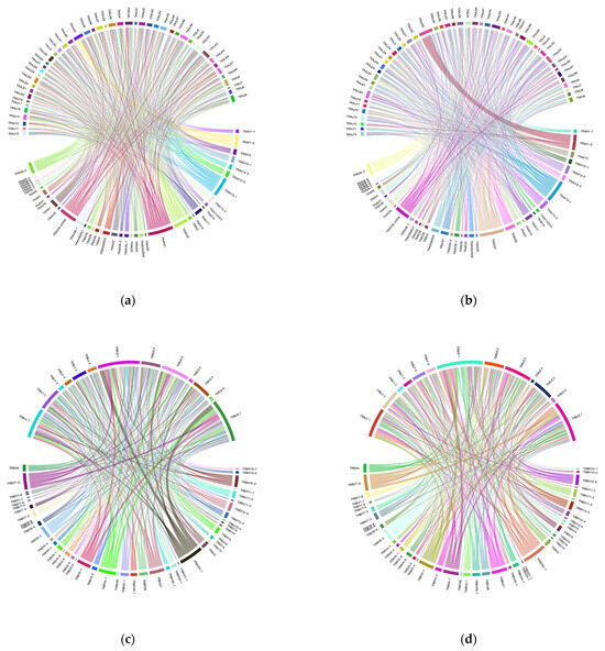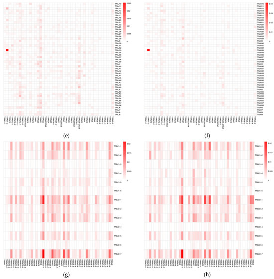 The merged sequences were BLASTed against the IMGT reference database to identify the best match for the germline VJ genes. The abundance of clones after mapping and clustering was calculated for each chain type at various time points. The Circo plots illustrate the interaction between TRAV–TRAJ or TRBV–TRBJ gene segments, where the connecting lines represent the pairing frequency of specific segments, with thicker lines indicating more common combinations (Figure 3a–d). The heatmaps revealed the dominant pairing genes between TRAV–TRAJ or TRBV–TRBJ, indicating clonal expansion and a favored V-J gene combination in the dataset (Figure 3e–h). Analysis of the full-length sequence and abundance of the identified VJ region in each sample is shown in Supplemental Table S1.