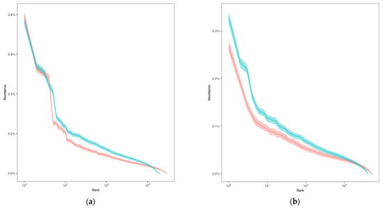 Rank–abundance curve plot. The horizontal axis represents CDR3 abundance ranking. The vertical axis represents the CDR3 abundance frequency corresponding to the number, and the shaded area indicates the 0.95 confidence interval obtained using the bootstrap method. The rank–abundance curves indicated a distribution pattern characterized by a few highly abundant clones at the top ranks and a long tail of numerous rare sequences. (a) CDR3 α chain; (b) CDR3 β chain. The blue tones indicate “preoperative” and red tones indicate “postoperative”.