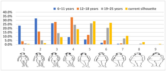 The Stunkard figure rating scale [38], was used to assess body silhouette across different life stages, which includes nine female body shape pictograms ranging from very slim (number 1) to very large (number 9) at six different life stages: childhood (6–11 years), adolescence (12–18 years), early adulthood (19–25 years) and the current body silhouette. Participants were asked to identify the figure that most closely resembled their body shape during each age periods (Figure 1).