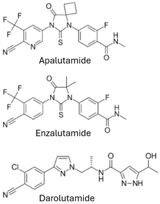 Emerging therapies are changing the landscape of treatments for mHSPC, providing targeted strategies for managing patients. ARPIs (steroidal and non-steroidal) have been researched since the 1960s. The clinical utility of steroidal ARPIs, such as abiraterone, a P450 c17 (CYP17) enzyme inhibitor, is limited by its adverse effects of cardiac and hepatic toxicity and hypertension. In contrast, non-steroidal ARPIs, including darolutamide, apalutamide, and enzalutamide, are more selective as pure androgen receptor blockers. Unlike abiraterone, their chemical structure is distinct from testosterone and progesterone; they are not associated with progesterone-related adverse effects, making them a safer therapeutic option. ARPIs act by competitively binding to the AR, blocking androgen-mediated signalling. This prevents AR nuclear translocation, co-activator transport, and DNA binding []. Figure 1 shows these compounds.