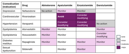 In patients with high-volume and high-risk/low-risk metastatic hormone-sensitive prostate cancer, treatment intensification with darolutamide, ADT, and docetaxel increased OS, consistent with the overall population; the results in the low-volume subgroup were suggestive of survival benefit. Darolutamide should be used with precaution in comorbidities requiring drugs like itraconazole, rifampicin, midazolam, dabigatran, and rosuvastatin due to potential drug–drug interactions []. Table 3 summarizes the effect of darolutamide in different patient profiles based on volume and risk of cancer.