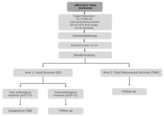 While most organ preservation trials have focused on TME vs. observation, some studies have offered another less invasive option, which is local excision of the tumor. Local excision spares the removal of the entire rectum and instead requires surgical transanal full-thickness rectal wall excision with a bowel margin of 1 cm, keeping most of the rectum functional. GRECCAR-2 was a multicenter phase III trial considered the first of a kind to compare local excision with TME in downstaged low rectal cancer. It included patients with cT2–T3 and N0–N1 (≤3 positive nodes ≤ 8 mm) low rectal cancer that was ≤8 cm from the anal verge, sized ≤ 4 cm, and eligible to receive chemoradiotherapy and major surgery [60]. These patients received neoadjuvant CRT given as 50 Gy in 25 fractions with concomitant fluorouracil, and those who achieved a good clinical response 8 weeks later, defined as a residual tumor of ≤2 cm, were randomized between a local excision group and a TME group. To ensure patient safety, for patients in the local excision group who had a poor pathological response (ypT2–T3 or R1), a completion total mesorectal excision was performed 1–4 weeks after local excision (Figure 2). The 5-year follow-up demonstrated similar oncologic outcomes between both groups, including LR, DM, OS, DFS, and cancer-specific mortality rates (Table 7). These outcomes suggest a new option for patients with small T2–T3 low rectal cancer that wish to avoid the morbidity associated with TME, given they respond well to CRT.