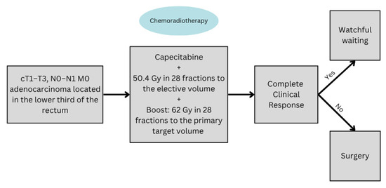 A Danish multicenter phase II trial was one of the most notable studies to report on radiation dose escalation as an organ preservation strategy [63]. It included patients with primary resectable T1–T3, N0–N1, M0 low rectal adenocarcinoma, where the N1 nodes had to be at the level of the tumor and included in the primary tumor volume. Radiotherapy was given concomitantly with capecitabine as IMRT and consisted of 50.4 Gy in 28 fractions to the elective volume, which included the mesorectal and presacral lymph nodes, along with the lateral pelvic lymph nodes, in addition to a concomitant boost of 62 Gy in 28 fractions to the primary target volume, which included the primary tumor and the rectal circumference at its level. Patients who achieved a cCR 6–12 weeks post-CRT were eligible for watchful waiting, while patients with an incomplete clinical response or regrowth were planned for surgery (Figure 3). The results were encouraging, with 86% of patients achieving a cCR after CRT alone, and 58.9% of the patients sustaining locoregional tumor control after 2-years of follow-up. The MFS and OS at 30 months were 85.4% and 94.8%, respectively, with patients reporting acceptable rates of side effects. The analysis of the treatment planning in this trial also showed that target coverage was reached in most plans with no substantial high-dose volumes reaching the organs at risk, most importantly the bladder and the intestines [64].