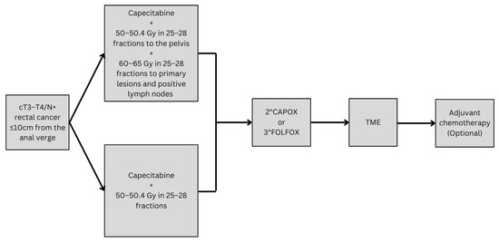 - Wang, X.; Liu, P.; Xiao, Y.; Meng, W.; Tang, Y.; Zhou, J.; Ding, P.-R.; Ding, K.-F.; Wang, B.; Guo, Q.; et al. Total neoadjuvant treatment with long-course radiotherapy versus concurrent chemoradiotherapy in local advanced rectal cancer with high risk factors (TNTCRT): A multicenter, randomized, open-label, phase 3 trial. J. Clin. Oncol. 2024, 42, LBA3511. [Google Scholar] [CrossRef]