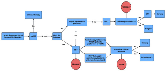 The current standard of care according to the most recent NCCN guidelines [8] depends on total neoadjuvant therapy (TNT), which consists of a neoadjuvant long course of chemoradiotherapy (CRT) or short-course RT followed or preceded by neoadjuvant chemotherapy. TNT is usually followed either by total mesorectal excision (TME) or surveillance depending on the patient’s clinical response. In select patients with low-risk features, neoadjuvant chemotherapy alone resulting in greater than 20% tumor regression may allow for the omission of radiotherapy, enabling them to proceed directly to surgical resection.