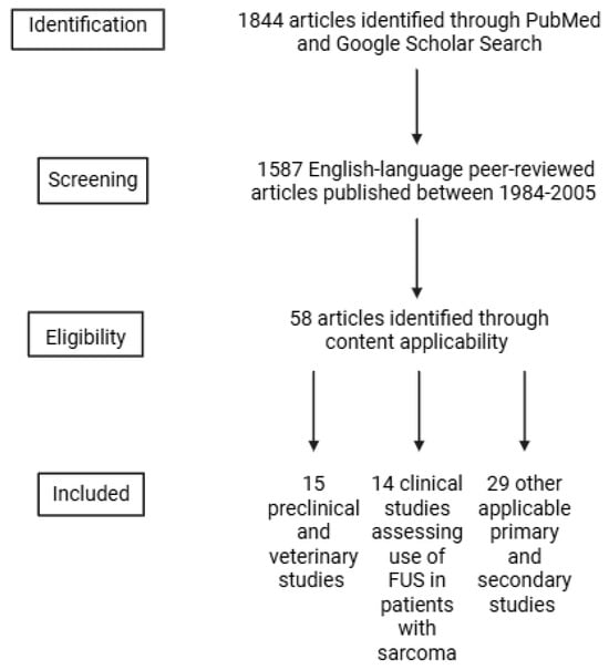A literature search was conducted in PubMed and Google Scholar using the keywords “focused ultrasound”, “high intensity focused ultrasound (HIFU)”, “histotripsy”, “sonodynamic therapy (SDT)”, “hyperthermia”, and Boolean operations, “and”/”or”, in conjunction with “sarcoma”. The inclusion criteria were (1) peer-reviewed English-language articles, (2) articles published between 1984 and 2025, (3) available full texts, and (4) articles that described sarcoma treatments, FUS mechanisms, and applications of FUS to sarcomas. In total, 58 references were included in this narrative review, including 15 preclinical and veterinary studies and 14 clinical studies. Clinical studies were primarily case reports and case series (Figure 1). Four authors (NK, NS, LH, and RGW) independently screened the articles for applicability. Figures were created in BioRender, and tables were created in Microsoft Excel.