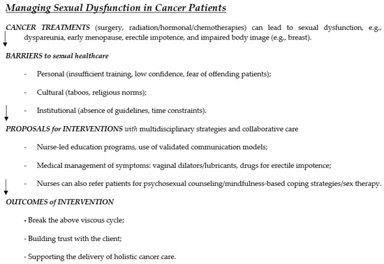 Empowering nurses through structured education, standardized guidelines, and open communication strategies is essential for improving patient outcomes. Addressing sexual dysfunction as a routine aspect of cancer care will enhance survivors’ quality of life and foster a more holistic approach to oncology treatment.