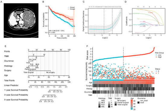 Prognostic analysis and nomogram development for patients with large RLS. (A) Preoperative imaging examinations of a case with large RLS. (B) Kaplan-Meier survival curves comparing OS between two groups (Group 1: Large group; Group 2: Non-group). (C) Selection of the optimal tuning parameter (λ) in the Lasso regression model using 10-fold cross-validation. The partial likelihood deviance is plotted against log(λ), and the optimal λ is determined at the point with the minimum mean cross-validated error. (D) Lasso coefficient profiles of the included variables. The vertical dashed line represents the optimal log(λ), where variables with non-zero coefficients are selected. (E) Nomogram for predicting 1-year, 3-year, and 5-year OS for patients with large RLS. (F) Risk score distribution and stratification of patients into low-risk and high-risk groups. The scatterplot demonstrates risk scores, survival times, and survival status (alive = 0, deceased = 1) along with key patient characteristics, including age, type of surgery, histology, TNM stage, and occurrence pattern (local vs. non-local). The dashed line separates the low-risk group from the high-risk group, as determined by the cutoff value. Abbreviations: OS, overall survival; TNM, tumor–node–metastasis; WDL, well-differentiated liposarcoma; PLS, pleomorphic liposarcoma; MLS, myxoid liposarcoma; DDL, dedifferentiated liposarcoma; RLS, retroperitoneal liposarcoma; Lasso, least absolute shrinkage and selection operator.
