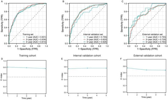 We further utilized time-dependent ROC curves to dynamically evaluate the discriminatory ability and performance of the constructed model, incorporating both survival outcomes and survival time. The results demonstrated that the model exhibited well predictive accuracy for 1-year (AUC = 83.1%), 3-year (AUC = 83.8%) and 5-year (AUC = 81.4%) survival in the training cohort (Figure 2A). Additionally, in both the internal (Figure 2B) and external validation sets (Figure 2C), the AUC values for 1-, 3-, and 5-year survival ranged from 72.9% to 83.8%, demonstrating robust predictive performance over time. Similarly, the time-dependent concordance index (C-index) was applied to validate the discrimination ability and efficiency of the model. We found that the C-index for 1-, 3-, and 5-year survival approached nearly 80% in the training cohort (Figure 2D) and both validation cohorts (Figure 2E,F). These results indicated favorable discrimination of the nomogram model.