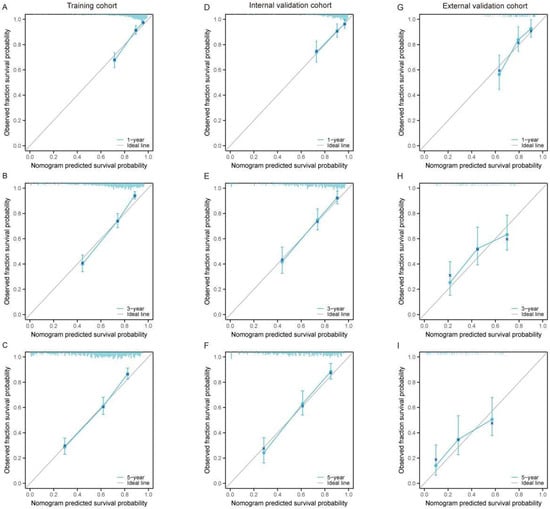 Calibration curves for the nomogram predicting 1-year, 3-year, and 5-year OS in large RLS across different cohorts. (A–C) Calibration curves for the training cohort at 1-year (A), 3-year (B), and 5-year (C) OS. (D–F) Calibration curves for the internal validation cohort at 1-year (D), 3-year (E), and 5-year (F) OS. (G–I) Calibration curves for the external validation cohort at 1-year (G), 3-year (H), and 5-year (I) OS. The x-axis represents the nomogram-predicted survival probability, while the y-axis represents the observed fraction survival probability. The solid diagonal line indicates the ideal prediction, where predicted probabilities perfectly align with observed outcomes. Blue lines show the model’s performance, with error bars representing the 95% confidence intervals. The proximity of the calibration curve to the diagonal line demonstrates the accuracy and reliability of the nomogram predictions. Abbreviations: OS, overall survival.