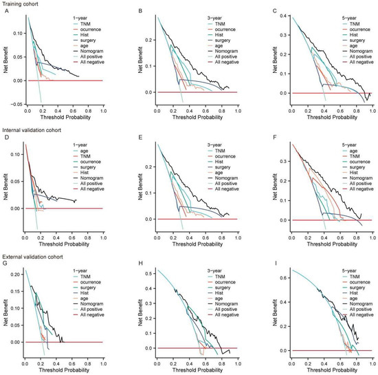 The DCA curve for the nomogram predicting 1-year, 3-year, and 5-year OS in large RLS across different cohorts. (A–C) DCA for the training cohort at 1-year (A), 3-year (B), and 5-year (C) OS. (D–F) DCA for the internal validation cohort at 1-year (D), 3-year (E), and 5-year (F) OS. (G–I) DCA for the external validation cohort at 1-year (G), 3-year (H), and 5-year (I) OS. The x-axis represents the threshold probability, while the y-axis represents the net benefit. The nomogram is compared to individual prognostic factors, including TNM stage, occurrence (local vs. non-local), histology (Hist), type of surgery, and age. The “All positive” line assumes all patients have the event, while the “All negative” line assumes none have the event. Abbreviations: OS, overall survival; TNM, tumor–node–metastasis; DCA, decision curve analysis; RLS, retroperitoneal liposarcoma.
