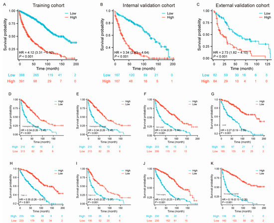 The median OS of patients with large RLS in this study was approximately 89 months (interquartile range [IQR]: 79–97 months) (Supplementary Figure S3). We used the nomogram model to calculate the total points for each individual and further stratified them based on risk. To validate the effectiveness of the constructed nomogram model, patients with a large RLS were divided into high-risk and low-risk groups. We initially stratified all patients into high-risk and low-risk groups within the training set (Figure 5A, HR = 4.12 [3.31–5.12], p < 0.001), internal validation set (Figure 5B, HR = 3.34 [2.40–4.46], p < 0.001), and external validation set (Figure 5C, HR = 2.73 [1.82–4.10], p < 0.001). The results showed that patients in the high-risk group had significantly shorter survival times, indicating that the predictive model demonstrated strong risk stratification capability. Additionally, we conducted subgroup risk stratification analyses based on key clinicopathological characteristics (Figure 5D–K). The results showed that the model consistently exhibited strong predictive performance across all subgroups, underscoring its robust risk stratification capability. These findings highlight the model’s reliability in survival prediction and its potential to serve as a valuable tool for clinical prognosis assessment.