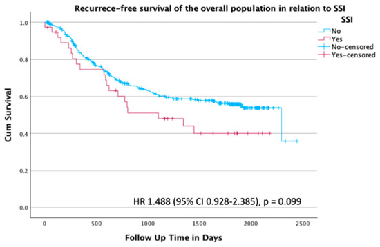 Kaplan–Meier survival plot for recurrence-free survival of the overall population stratified by presence or absence of SSI; hazard ratio (HR) 1.488 (95% confidence interval (CI) 0.928–2.385), p = 0.099.