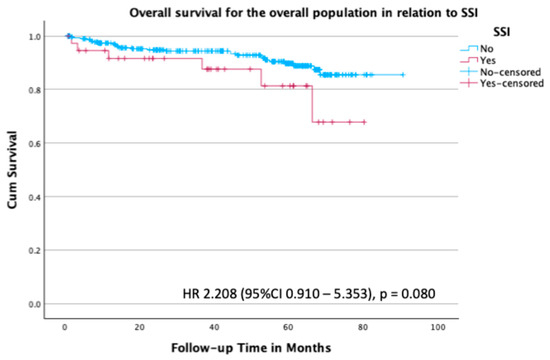 Overall survival in the total population in relation to SSI was not statistically significant, with a hazard ratio (HR) of 2.21 (95% CI 0.910–5.353; p = 0.080) (Figure 2).
