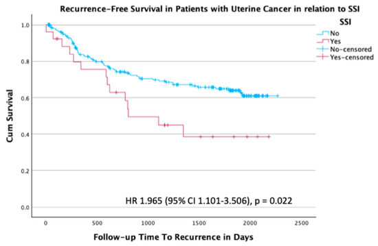 Kaplan–Meier survival plot for recurrence-free survival in the subgroup of patients with uterine cancer stratified by the presence or absence of SSI, with an HR of 1.965 (95% CI 1.101–3.506; p = 0.022).