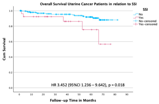 Overall survival results for patients with uterine cancer are shown in Figure 4. Patients with uterine cancer who had an SSI had a 3.5-fold increased risk of death in comparison to those without an SSI, with an HR of 3.45 (95% CI 1.236–9.642; p = 0.018) (Figure 4).