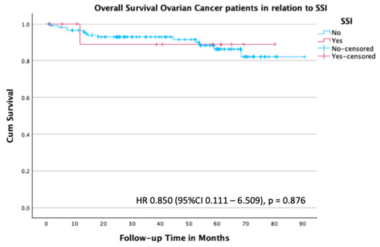 In line with these findings, the Kaplan–Meier analysis for overall survival did not show a significant difference between patients with and without an SSI (HR 0.85; 95% CI 0.111–6.509; p = 0.876) (Figure 5).