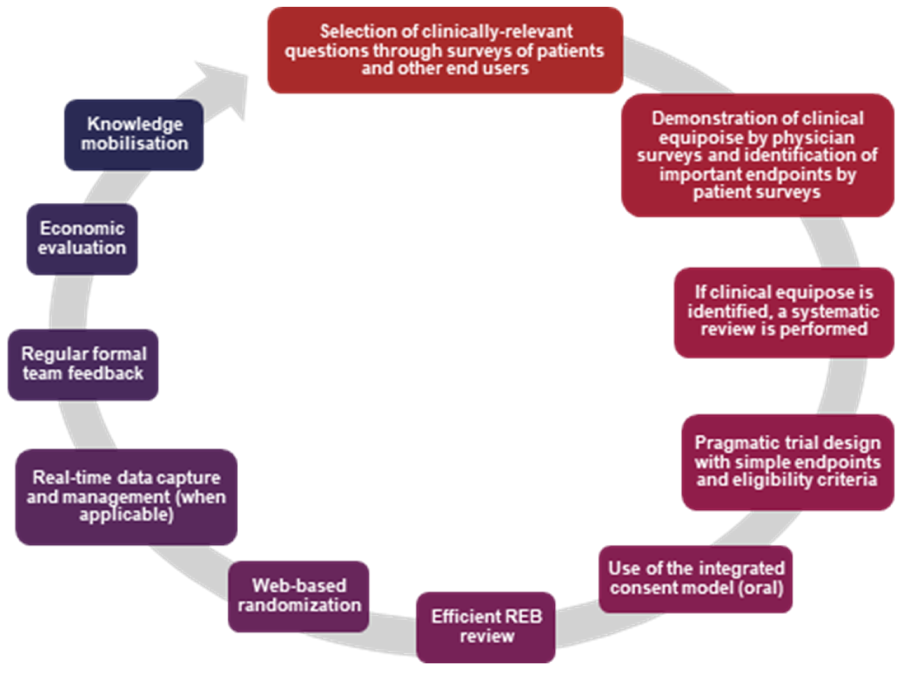A randomized pilot trial comparing vascular access strategies for early-stage breast cancer patients receiving non-trastuzumab containing chemotherapy (REaCT-VA HER2-negative) [25] NCT02688998 [Internal funds] | 150 (2) | Completed | While meeting its a priori feasibility criteria for patient engagement, the slow accrual means that conducting a large pragmatic trial would require overcoming the barriers to physician recruitment. |
