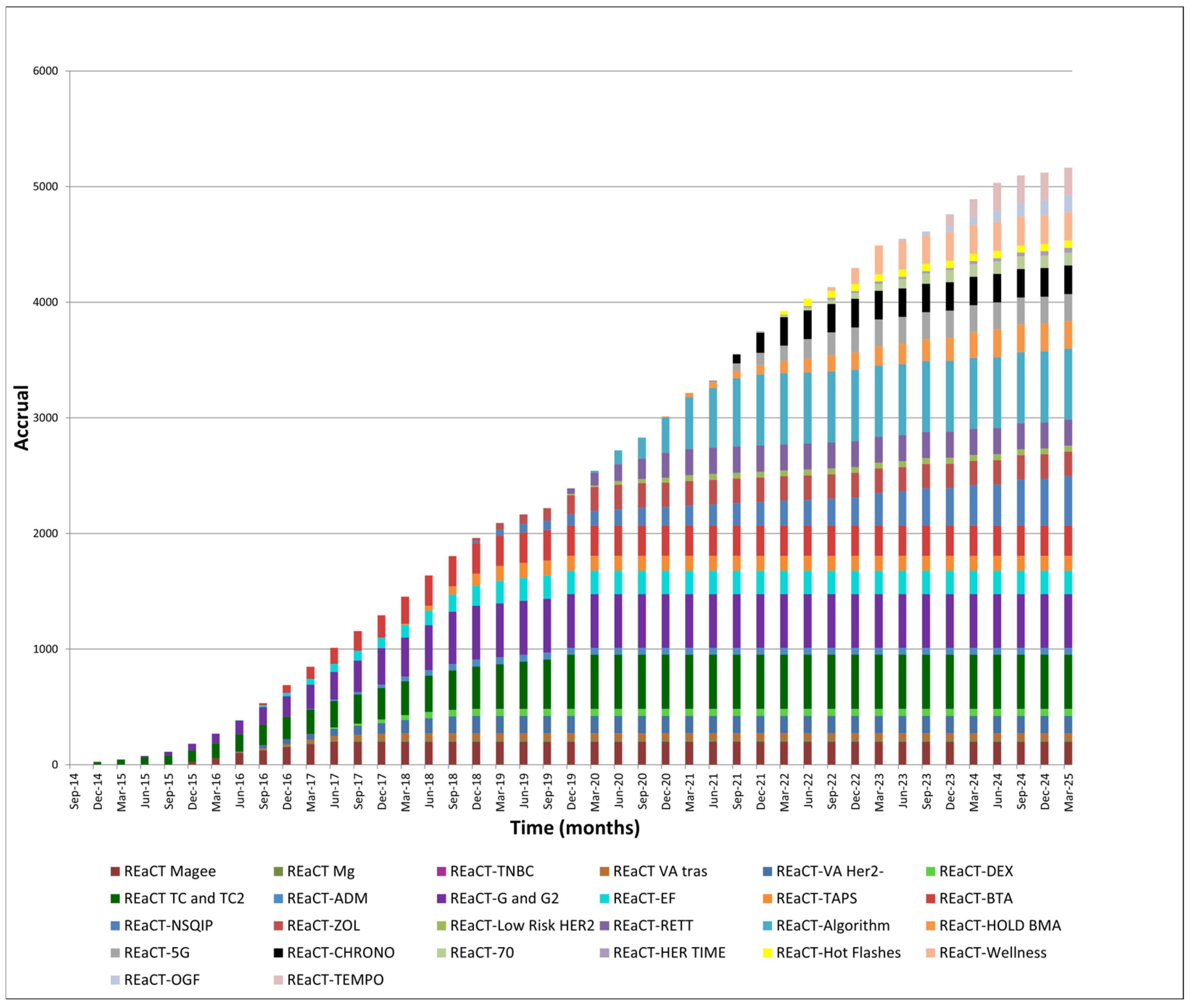 A randomized pragmatic trial evaluating omission of granulocyte colony-stimulating factors in breast cancer patients receiving paclitaxel portion of dose-dense adriamycin–cyclophosphamide and paclitaxel chemotherapy (REaCT-OGF) NCT05753618 [TOHAMO Innovation Grant] | 105 (3) | Ongoing accrual | To come |