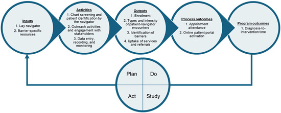 In addition to the community site lung navigator, the core QI team included the community site lung navigator program physician champion and a collaborating thoracic surgeon. Additionally, two patient partners, who were lung cancer survivors living in AV, provided input on program development and delivery. Participants included patients, COH-AV treating physicians, medical staff assistants, a social worker, financial counselors, tobacco specialists, and the QI team. The Rapid Cycle Research framework was used to inform the QI project delivery. This framework consists of six phases: (1) preparation; (2) problem exploration; (3) knowledge exploration; (4) solution development; (5) solution testing; and (6) implementation and dissemination [40]. We used Plan-Do-Study-Act (PDSA) [41] cycles for phases 3–5 of the framework over the 34-month project timeline. The PDSA cycles were guided by a logic model of inputs, activities, outputs, process outcomes, and program outcomes, outlined in Figure 1. PDSA cycles included regular virtual meetings with the QI team, staff, and patient partners on navigator competency and skill evaluation, patient experience reflections for program adaptation, process and standard operating procedures, intensity of the program, patient stakeholder involvement in program awareness, staff participant huddles, and program activities, challenges, and triumphs.