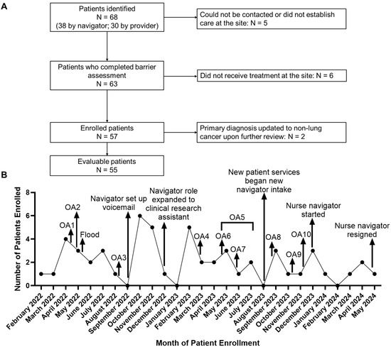 (A) Patient enrollment schema. (B) Program patterns and adaptations, depicted by the number of patients enrolled in the navigator program by month. Arrows indicate the points of occurrence of important activities or events during the navigator program. Primary care outreach activities (OAs): OA1—Annual Lancaster Poppy Festival; OA2—External Community Physician Outreach; OA3—Community Outreach Lung Cancer Awareness Dinner; OA4—Health equity in action; OA5—brochures introduced and distributed by physician liaison/marketing team; OA6—Senior and Aging Adults Resource Fair; OA7—Lung Cancer Awareness Presentation at Independent Senior Living Facility; OA8—Community Outreach at local church; OA9—Virtual presentation on Lung Cancer Screening Program to Mammoth providers; OA10—COH Marketing Team distributed emails to be sent to potential referring physicians to promote program.