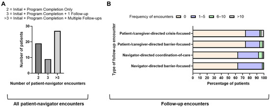 Types of patient–navigator encounters: (A) total patient–navigator encounters; (B) navigator-directed barrier-focused encounters, navigator-directed coordination-of-care encounters, patient-/caregiver-directed barrier-focused encounters, and patient-/caregiver-directed crisis-focused encounters.