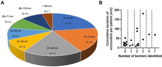 Among the evaluable patients for whom encounter duration data were available, the median intensity of navigation was 23 min (interquartile range 35 min). Five patients had cumulative navigator encounter durations under 15 min (Figure 4A). Meanwhile, five patients had cumulative navigator encounter durations that exceeded an hour (69–181 min) (Figure 4A). Four (80.0%) of these patients had a lung cancer diagnosis at enrollment, three of whom had advanced cancer (stage III/IV). All five patients with cumulative encounter durations exceeding an hour had 2–7 barriers (Figure 4B), with transportation and Internet accessibility concerns being among the most common barriers (4/5 patients; 80%). Expectedly, a larger number of identified barriers was significantly associated with a longer cumulative duration of patient–navigator encounters (Spearman’s r = 0.39, p = 0.035).