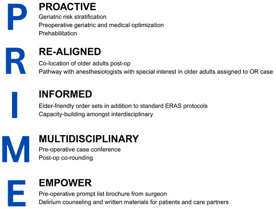 The Older Adults Surgery and Oncology Program at St. Michael’s Hospital established a whole pathway perioperative geriatrics strategy, PRIME (see Figure 1). The strategy integrates geriatric principles and embeds clinicians with geriatrics expertise into the care pathway of older adults undergoing surgery from preoperative through to postoperative care. All patients aged 70 years and older received the PRIME strategy. The details of the care pathway are provided below in accordance with the Template for Intervention Description and Replication (TIDieR) guidelines [16].