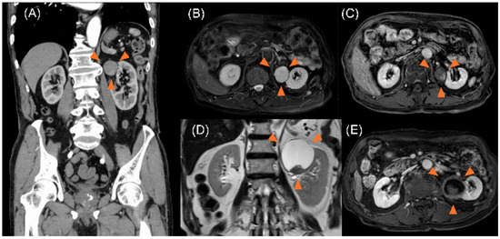 An 86-year-old male patient with a history of gastric ulcers and hypertension was admitted to the Department of Dermatology for burn treatment. A left retroperitoneal tumor was incidentally identified on computed tomography (CT). Consequently, the patient was referred to the Department of Urology for further evaluation. Contrast-enhanced CT and magnetic resonance imaging revealed a cystic lesion (31 × 32 × 31 mm) with solid components near the upper pole of the left kidney (Figure 1A–C). The decision to proceed with initial surveillance was based on the following factors: (1) the patient was 86 years of age and had multiple comorbidities, (2) the lesion was asymptomatic, (3) the initial lesion was small, with no clear evidence of progressive characteristics, and (4) the patient strongly desired to avoid surgery at that time after receiving comprehensive counseling on the risks and benefits. Subsequent imaging examinations were performed at 3–4-month intervals to monitor tumor progression. However, the tumor gradually increased in size and reached 58 × 60 × 59 mm approximately 3 years later (Figure 1D,E).