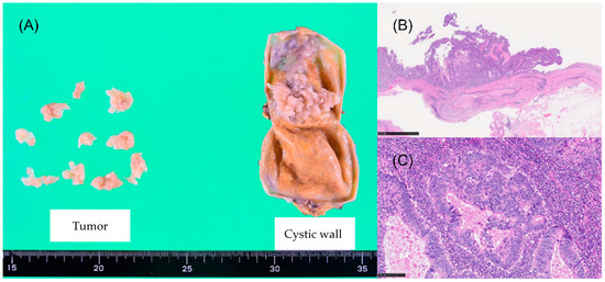 Macroscopic examination revealed solid papillary components in the cystic tumor (Figure 3A). Histological analysis indicated a single layer of cuboidal to flat epithelial cells, despite the majority of the cyst wall exhibiting signs of cell desquamation. Papillary tumors were identified based on the presence of atypical glandular cells forming tubular and papillary structures, numerous nuclei with mitotic activity, and inflammatory cell infiltration (Figure 3B,C).