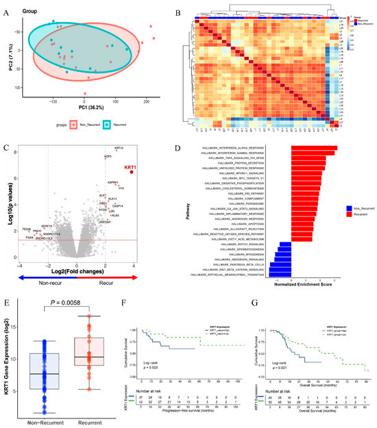 Differentially expressed genes (DEGs) in recurrence and non-recurrence groups: (A) Principal component analysis (PCA) plot comparing recurrence and non-recurrence groups. (B) Heatmap showing unsupervised hierarchical clustering of 11 recurrent and 21 non-recurrent cases based on gene expression profiles. (C) Volcano plot displaying DEGs based on recurrence, with fold changes and p-values. (D) Gene set enrichment analysis (GSEA) demonstrating enrichment of the interferon-alpha response and epithelial–mesenchymal transition pathways from KEGG gene sets in recurrence and non-recurrence groups, respectively. (E) Box plots showing elevated KRT1 expression levels in the recurrence group. (F) Kaplan–Meier estimates of progression-free survival according to KRT1 expression levels using TCGA datasets. (G) Kaplan–Meier estimates of overall survival according to KRT1 expression levels using TCGA datasets.