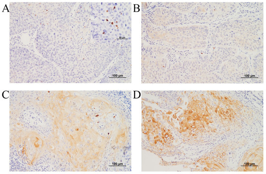 Representative microscopy images of KRT1 expression in laryngeal squamous cell carcinoma: (A) Negative KRT1 expression with dot-like positivity, shown in the inset box. (B) KRT1 expression of intensity 1. (C) KRT1 expression of intensity 2. (D) KRT1 expression of intensity 3. (A–D: immunohistochemistry, original magnification ×200).
