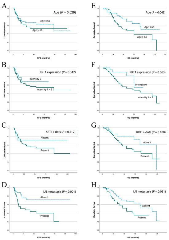 Kaplan–Meier analysis demonstrated that lymph node metastasis was significantly associated with shorter recurrence-free survival and overall survival (p = 0.001 and p = 0.031, respectively; Figure 3). Advanced age, positive KRT1 expression, and the presence of KRT1-positive dots exhibited trends toward shorter recurrence-free survival periods, although these associations did not reach statistical significance. In overall survival analysis, advanced age significantly predicted worse survival outcomes (p = 0.043), whereas positive KRT1 expression showed a marginally significant predictive effect (p = 0.063). Consistent with the recurrence-free survival findings, the presence of KRT1-positive dots demonstrated a tendency toward worse overall survival.