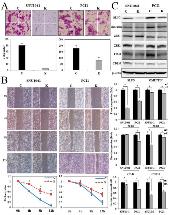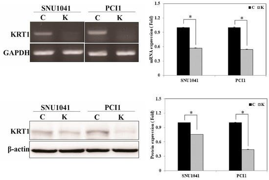 KRT1 inhibition in human head and neck cancer cells. mRNA and protein levels were reduced in KRT1-knockdown SNU-1041 and PCl1 cells compared with negative control siRNA-transfected cells, as demonstrated by RT-PCR (upper panel) and Western blotting (lower panel). RT-PCR, reverse transcription-polymerase chain reaction; siRNA, small interfering RNA; C, negative control siRNA-transfected cells; K, KRT1-specific siRNA-transfected cells; * p < 0.05.