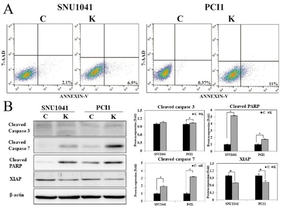 Effects of KRT1 knockdown on cell apoptosis in human head and neck cancer cells: (A) In the cell apoptosis assay, representative dot plots demonstrated that KRT1-knockdown SNU-1041 and PCl1 cells exhibited higher levels of apoptosis compared with control cells. (B) Levels of cleaved caspase-3, caspase-7, and cleaved PARP were elevated in KRT1-knockdown SNU-1041 and PCl1 cells compared with control cells. XIAP expression was lower in KRT1-knockdown SNU-1041 and PCl1 cells than in control cells. C, negative control siRNA-transfected cells; K, KRT1-specific siRNA-transfected cells; PARP, poly(ADP-ribose) polymerase; XIAP, X-linked inhibitor of apoptosis protein; 7-AAD, 7-amino-actinomycin D; * p < 0.05.